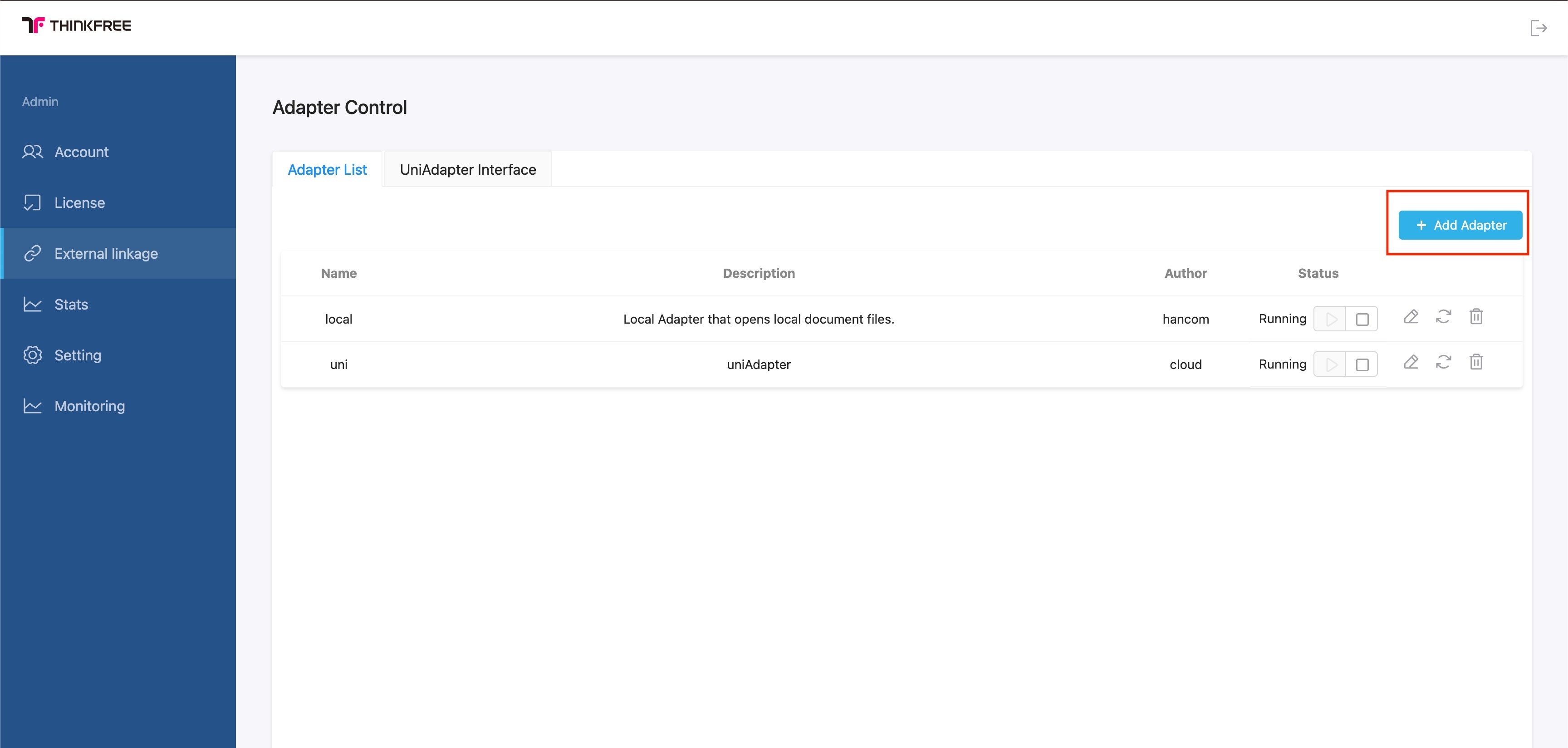 Navigate to External Linkage → Add Adapter.