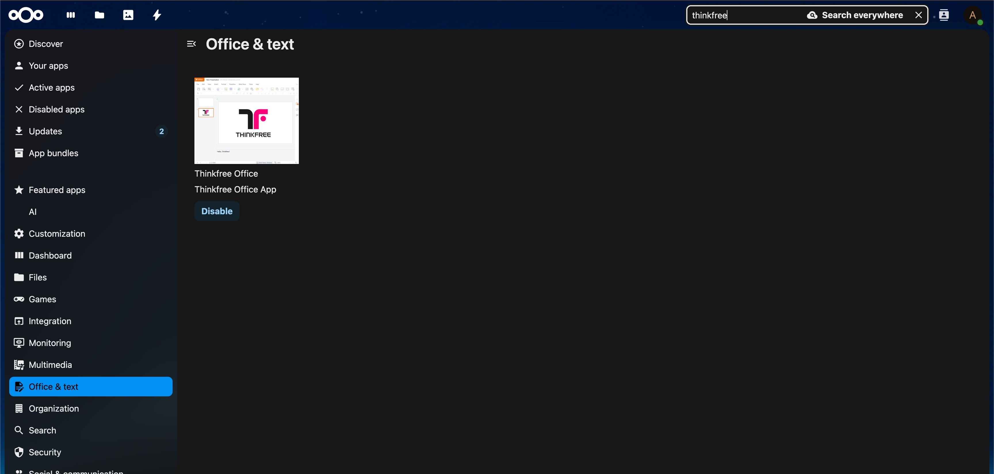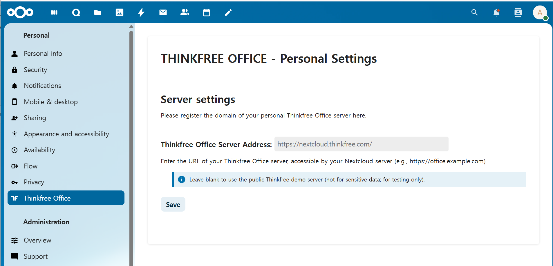 The Thinkfree Office server is reachable from Nextcloud.