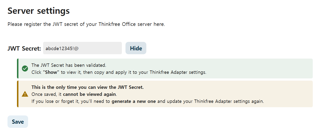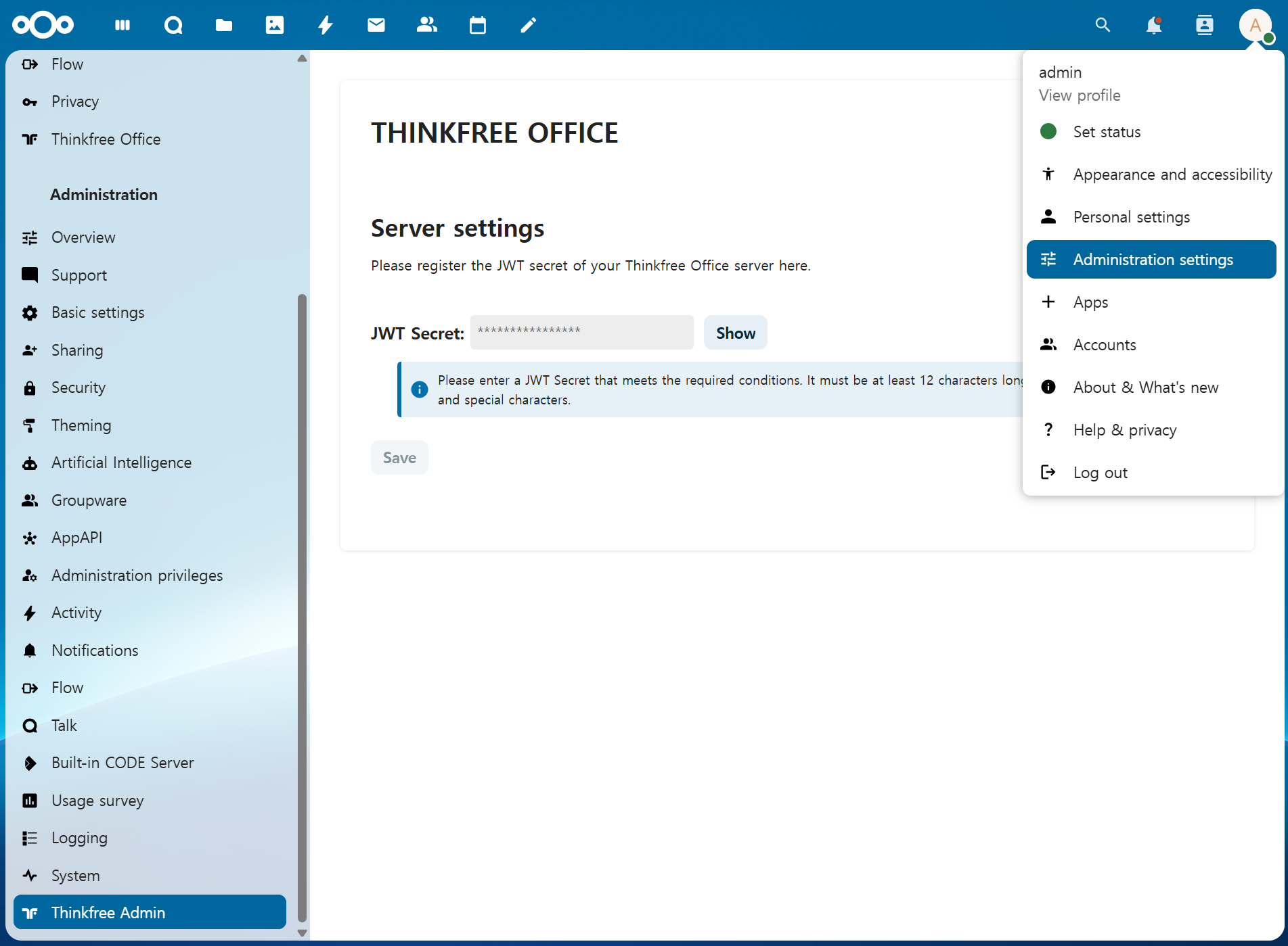 jwt_secretmust match exactly between Thinkfree Office and Nextcloud.