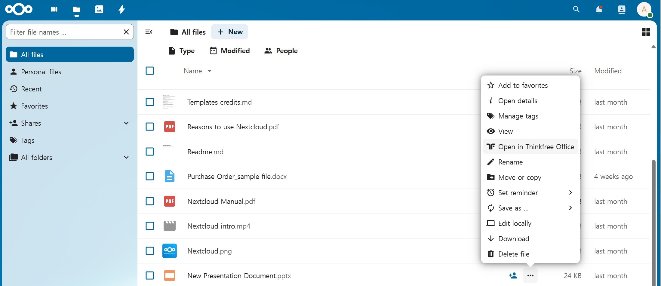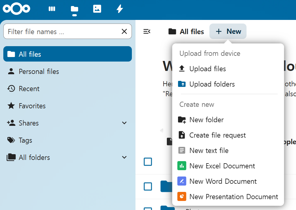 Click Create New in Nextcloud → choose a document type. A new file is created in your storage using a default Thinkfree template.