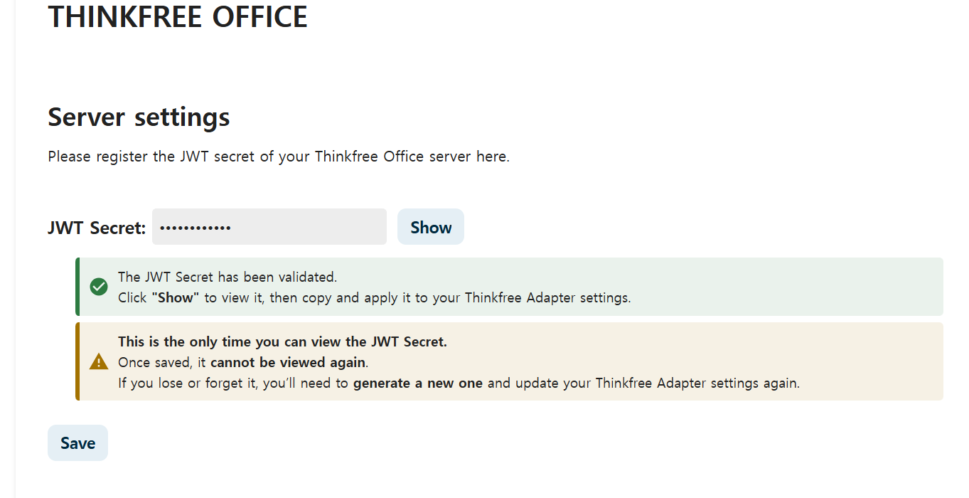 Enter your Thinkfree Office server URL (e.g.https://office.example.com).
