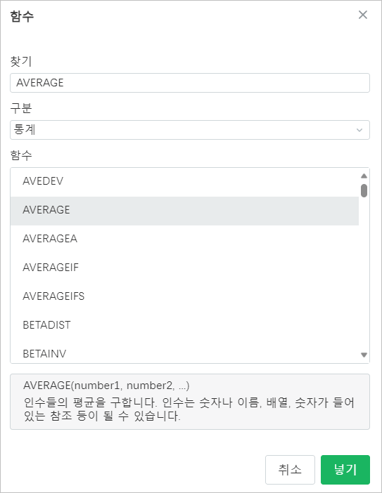 - 통계 하위 함수 목록이 대화 상자 오른쪽에 나타나면 AVERAGE를 선택합니다.